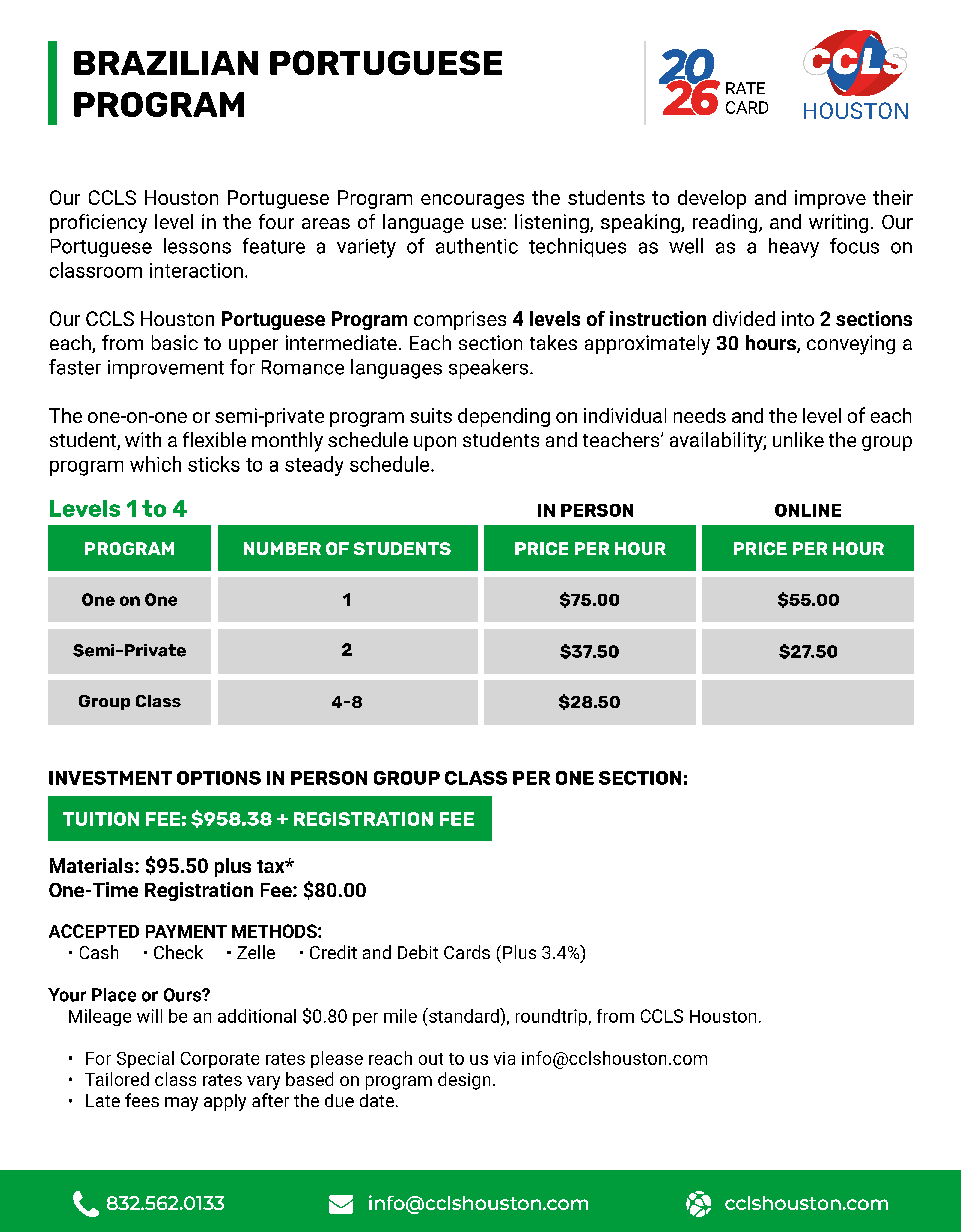 Our CCLS Houston Portuguese Program comprises 4 levels of instruction, from basic to upper Intermediate. Each level takes approximately 60 hours, conveying a faster improvement for Romance languages speakers.