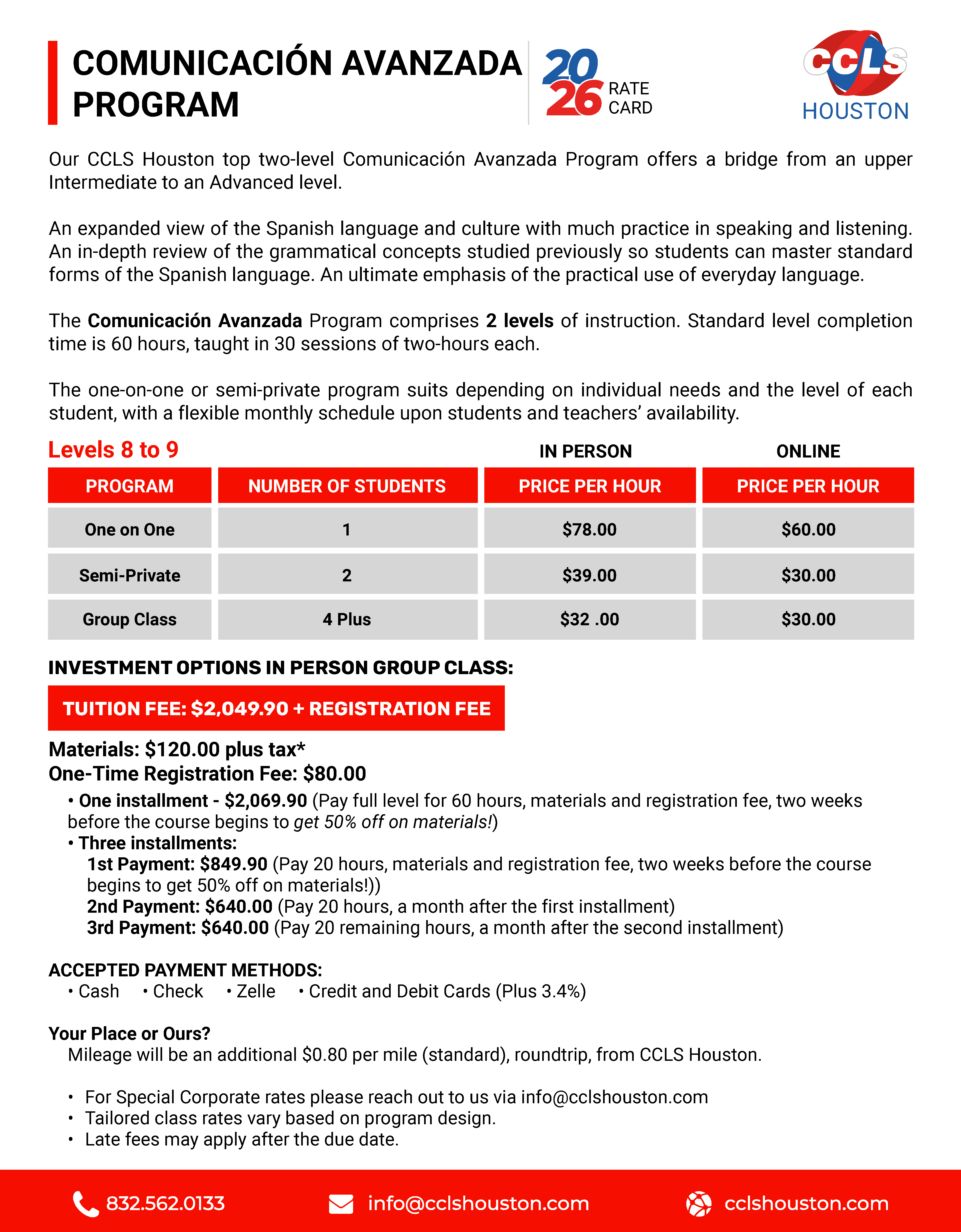 Our CCLS Houston top two-level Comunicación Avanzada Program offers a bridge from an upper Intermediate to an Advanced level.