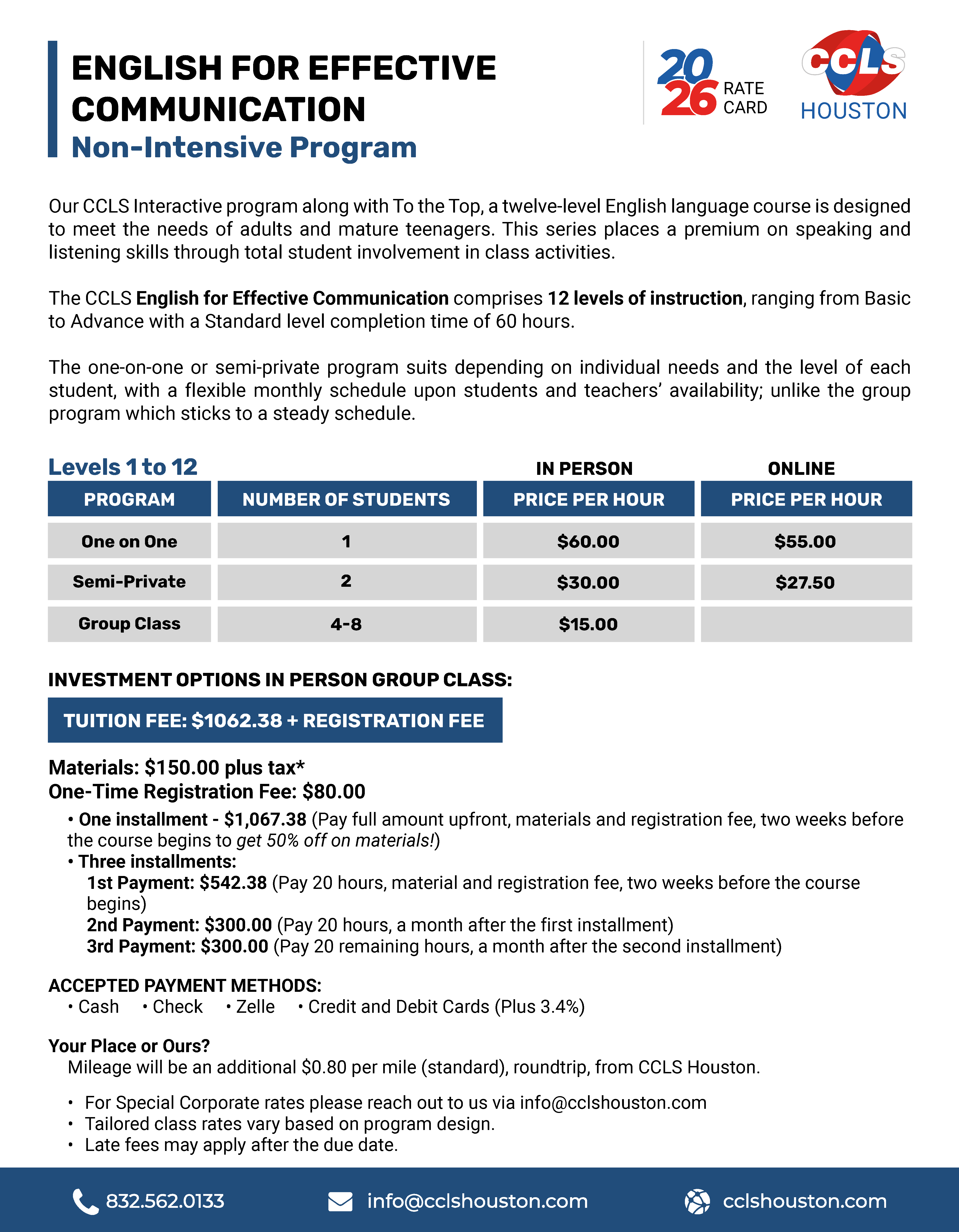 The CCLS English for Effective Communication non-intensive comprises 12 levels of instruction, ranging from Basic to Advance with a Standard level completion time of 60 hours.